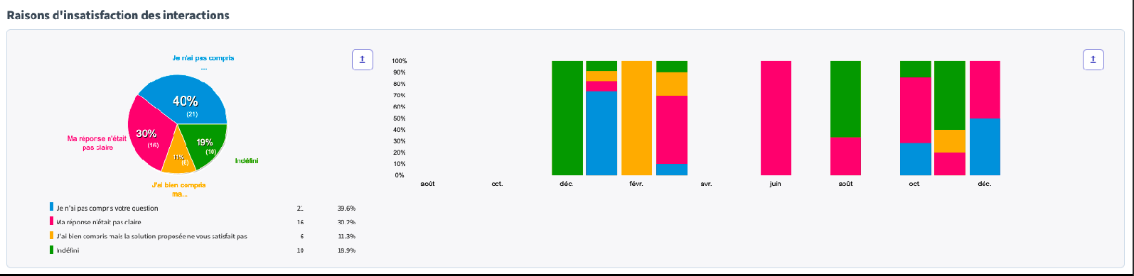 This section allows you to obtain the proportion of negative and positive feedback given by users on the answers given by the bot as well as the graphical evolution of this data.