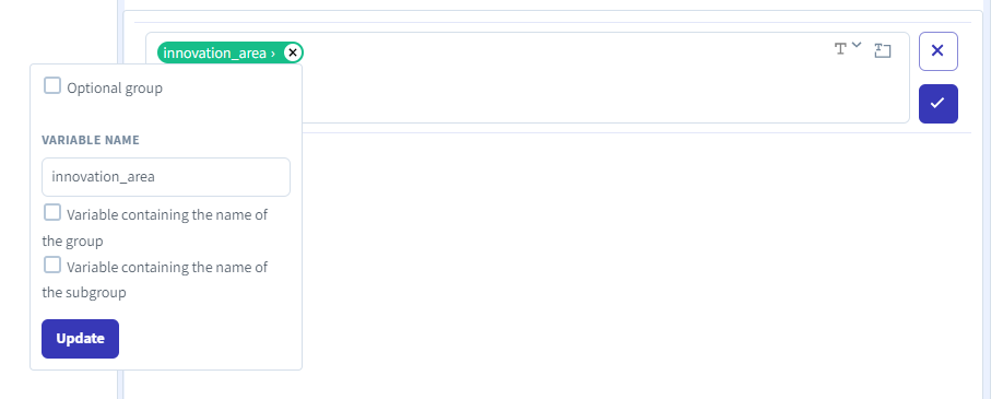 It is possible to insert matching groups as variables. In our example, the goal will be to recover the innovation field the user's idea refers to in order to get this type of knowledge: