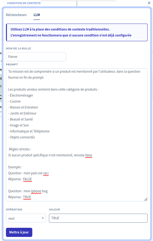 Using an LLM context condition allows the bot to analyze a situation automatically using a prompt. Everything is configured simply in a dedicated tab.