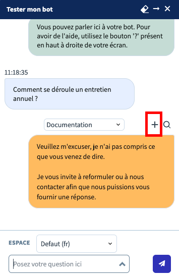 1. To create a new knowledge item from the test bot, click on the the **+** button above the bot's answer.