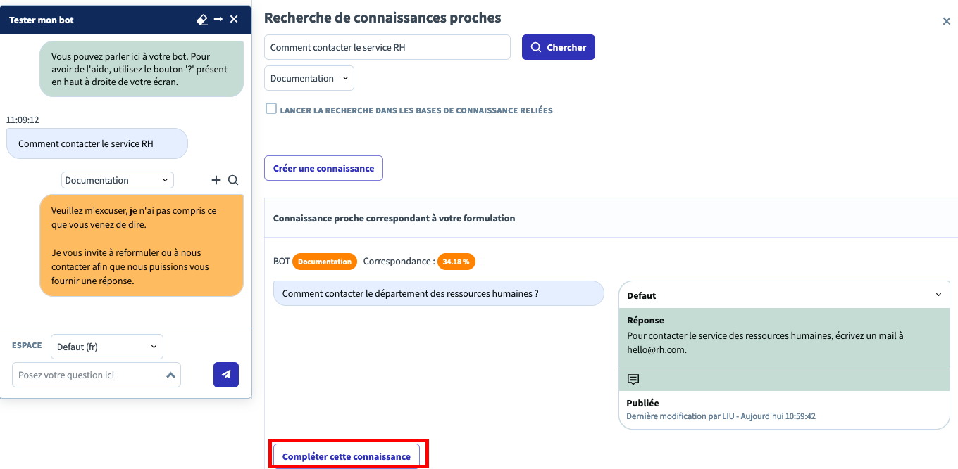 This will open on the right of your screen a list of knowledge items that have been analyzed by the bot for this query sorted from the highest score to the lowest.
