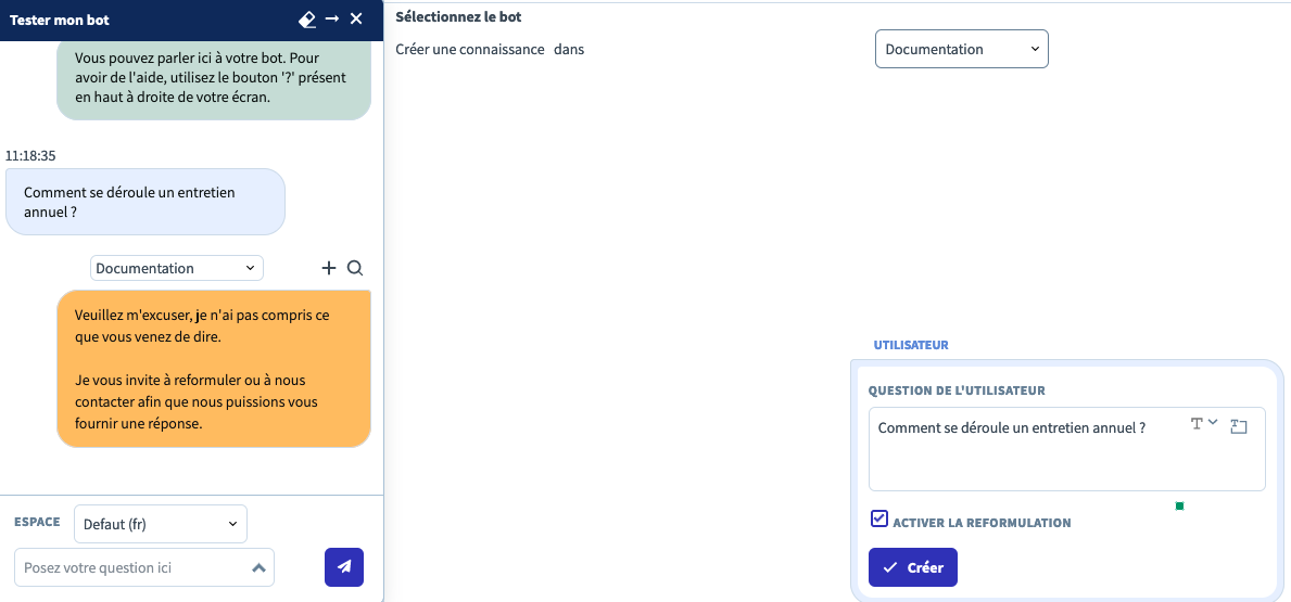 As you build your bot in **Dydu BMS**, you can use the **test bot** to see how the bot responds to user questions, allowing you to detect and correct any unexpected behavior.
