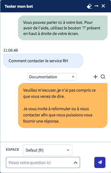 When the test bot does not understand a user query, it will provide a general phrase shown in the orange color. (This general phrase can be personnalized [here](https://dev.docs.dydu.ai/docs/Complementary_items/global_sentences#misunderstood-sentences).)