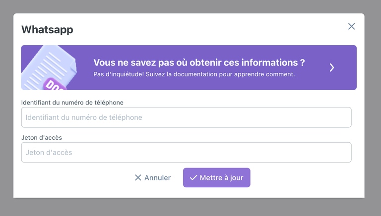 13. You are then redirected to the configuration of your integration from the Channels menu. A “WhatsApp” modal is opened.