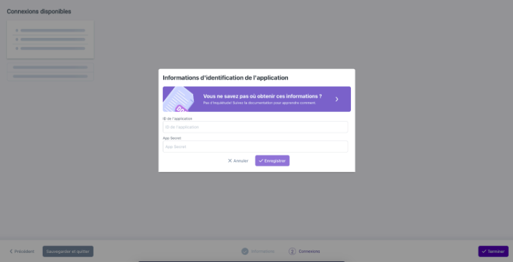 7. A **modal window** will open — enter your **Meta application ID** and **application secret key**.