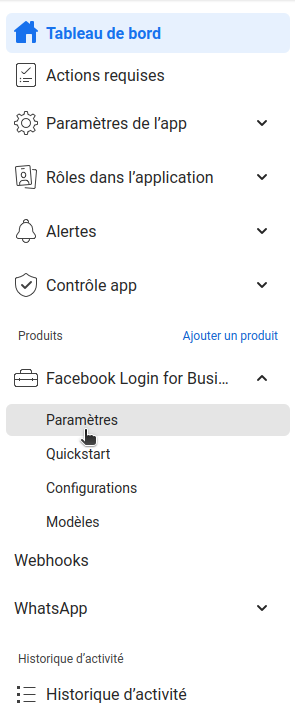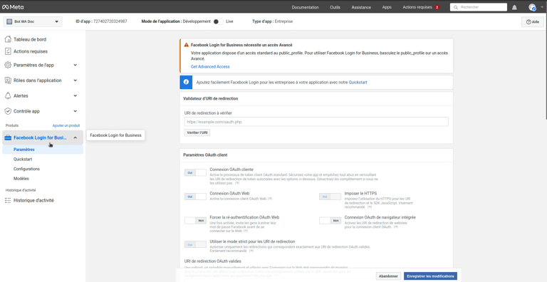 3. The **Settings page** for **Facebook Login for Business** will open, and a new **“Facebook Login for Business” section** will appear in the **left-hand menu**.