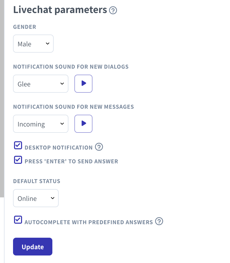 The parameters present in this section are personal and will not affect the settings of other Livechat operators. In these settings, you will be able to :&#x20;